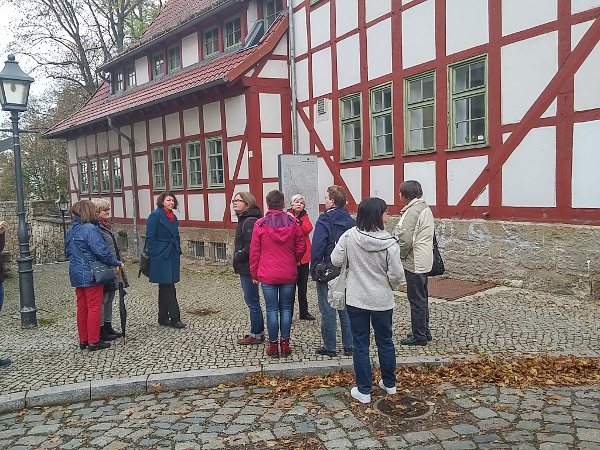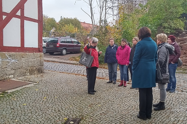 Ingelore Kneffel (li.) mit Teilnehmerinnen beim Stadtrundgang durch Nordhausen. Wussten Sie, dass die erste deutsche Königin Mathilde (895-968) in Nordhausen einen Frauenstift errichtete? Oder dass drei ihrer fünf Kinder, die sie mit König Heinrich hatte, in Nordhausen geboren wurden? Viele unvermutete Fakten hatte Heidelore Kneffel für die Teilnehmerinnen parat.