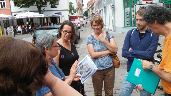 Kurzer Halt am Wenigemarkt. Barbara Sengewald (li.) berichtet über das Zustandekommen eines Gottesdienstes am 8.10.1989 Einen geführten Stadtspaziergang zu den Orten der friedlichen Revolution 1989 in Erfurt unternahmen am 20. Juli auf Einladung der ASF Thüringen interessierte Männer und Frauen. Barbara und Matthias Sengewald, engagierte Zeitzeugen dieser Umbruchzeit, haben in den Nachwendejahren die Gesellschaft für Zeitgeschichte e.V. gegründet und unter anderem einen Stadtspaziergang entwickelt. "Uns störte, dass meist nur an die negativen Seiten der Diktatur erinnert wurde. Natürlich ist das sehr wichtig, aber auch die Revolution, die vom Volk ausging und ohne Gewalt auskam, muss Beachtung finden," erklärte Barbara Sengewald den Teilnehmern.
