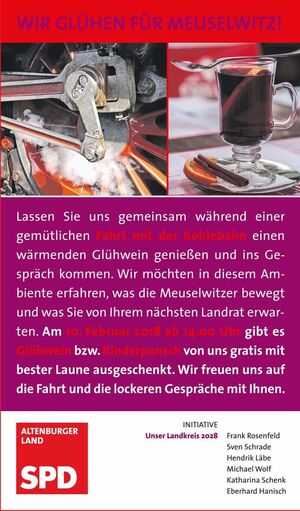 Der SPD-Kreisverband Altenburger Land lädt Frauen, Männer und Familien für Samstag, den 10.02.2018, 14:00 Uhr, zu einer gemütlichen Fahrt mit der Kohlebahn ab Meuselwitz (Georgenstr. 46) ein.