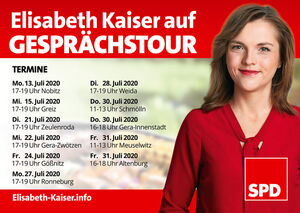 Die SPD-Bundestagsabgeordnete Elisabeth Kaiser wird in den kommenden Wochen im Rahmen ihrer Gesprächstour in vielen Orten Ostthüringens Station machen. Während Ihrer Besuche wird sie für alle interessierten Bürgerinnen und Bürger und ihre Anliegen ein offenes Ohr haben.